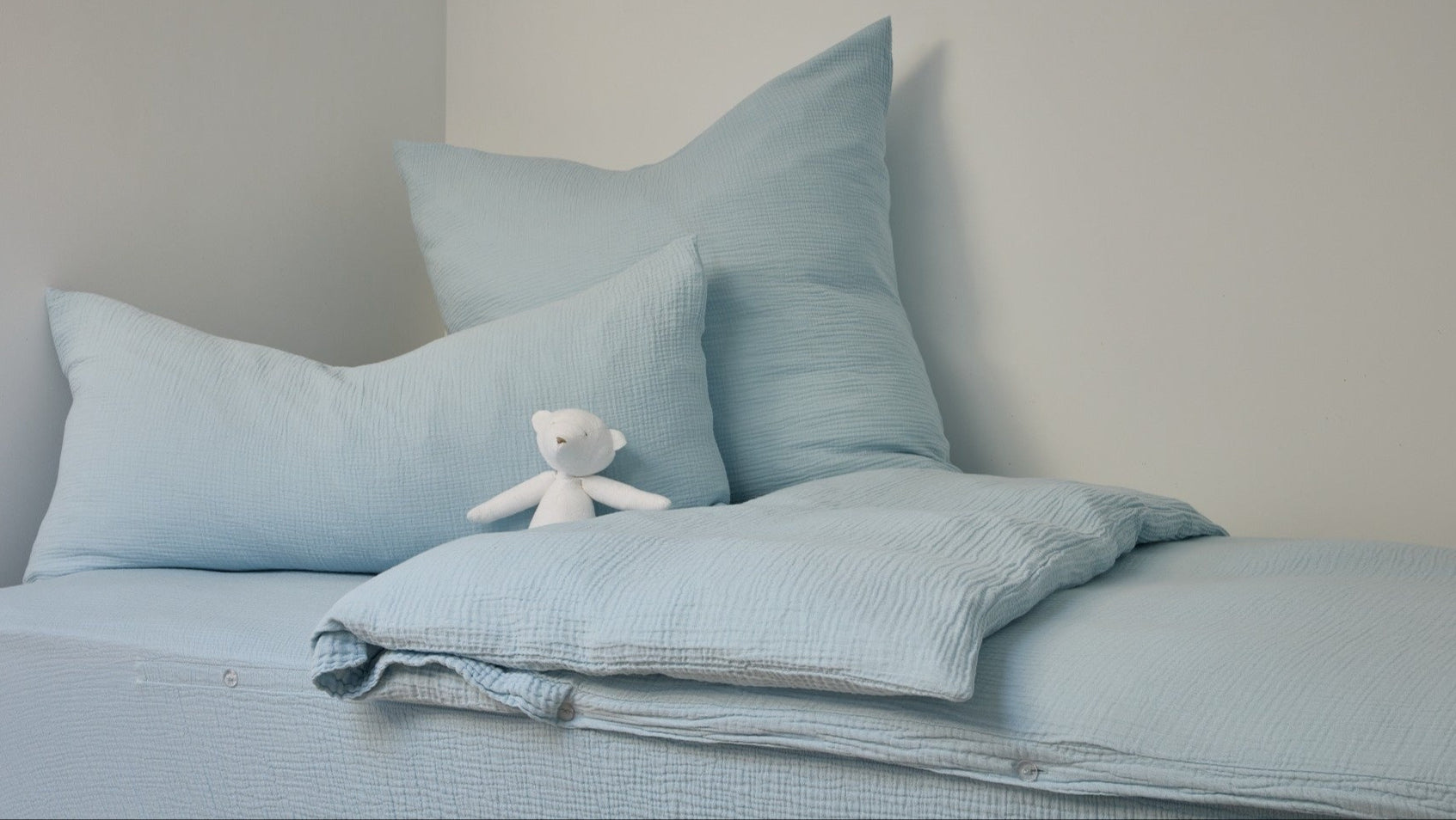 Unsere Bio-Musselin-Bettwäsche ist nicht nur weich, sondern auch extrem pflegeleicht. Du kannst sie problemlos bei 60°C waschen – das ist bei Musselin nicht selbstverständlich und ideal für den Alltag mit Kindern. Auch der Trockner ist kein Problem. Und das Bügeleisen kannst du getrost im Schrank lassen – der typische Crinkle-Look gehört einfach dazu.